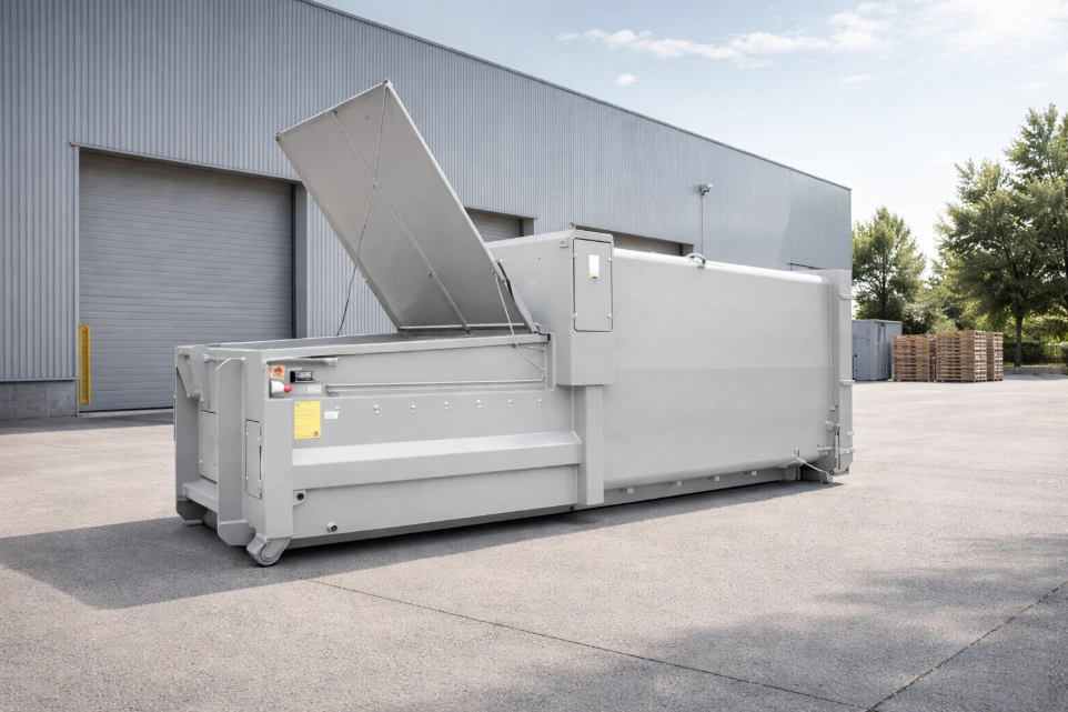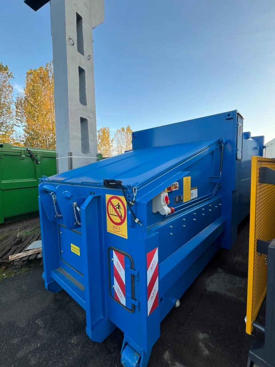 Krokhängd komprimator med stort inkast och hög stämpel, vilket gör den idealisk för hantering av exempelvis större kartonger och skrymmande material. Den höga stämpeln säkerställer att avfall av viss storlek inte blir kvar ovanpå stämpeln, utan matas effektivt vidare i komprimeringsprocessen.