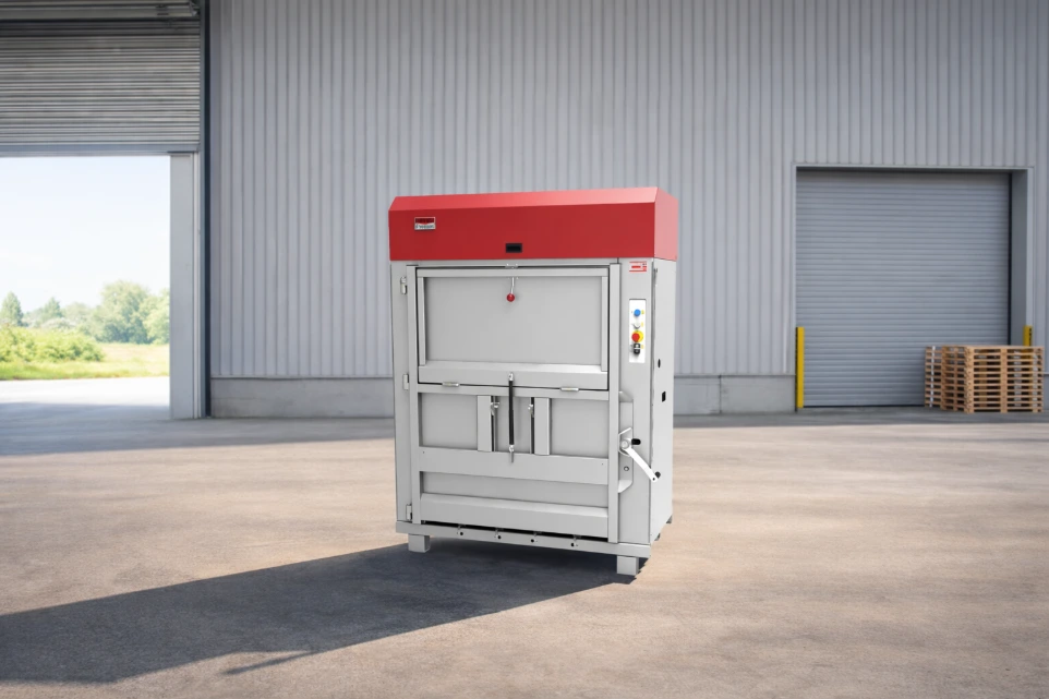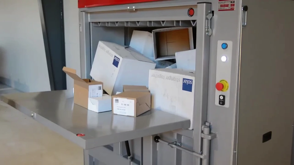Maskinen har en dörr som kan öppnas 180 grader, vilket sparar utrymme när kartong-/plastbalen ska transporteras bort.